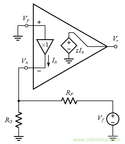 有人可能仍然不喜歡電流反饋放大器輸入端之間的緩沖器,甚至認為電流反饋這個名稱不夠好。如果能夠使用輸入端之間呈現很高阻抗的電流反饋放大器模型是最好的,這樣我們就能以大家熟悉的分壓型運放電路來表達反饋系數。