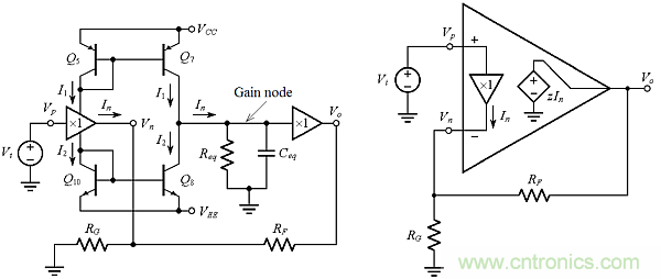 在沒有外部網絡的條件下,圖1中被Q1和Q2抽取的電流是相等的,即I1=I2。當存在如圖2a所示的外部網絡時,通過KCL可以得出I1=I2+In。電流反射鏡在增益節(jié)點復制I1和I2,因此進入這個節(jié)點的凈電流就是圖中所示的In。增益節(jié)點對In進行響應,會產生電壓z(jf)In,其中z(jf)=Req||(2πjfCeq)-1。該電壓隨即被緩沖到輸出端,產生: