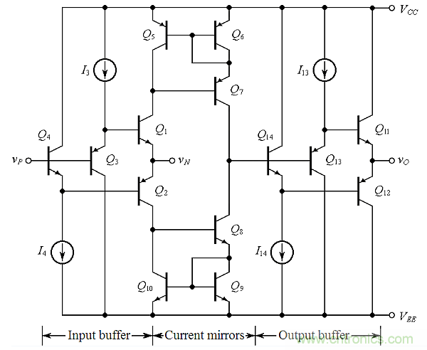 (a)一個具有高輸入阻抗和低輸出阻抗的輸入電壓緩沖器(Q1到Q4); (b)一對電流反射鏡(Q5到Q7,Q8到Q10); (c)一個輸出電壓緩沖器(Q11到Q14)。