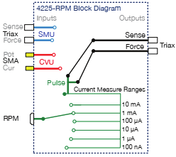 在Endurance或Retention測試中,由于是測量陣列長時(shí)間、多脈沖下的可靠性特性,往往對Read電流的精度要求很高,用于精準(zhǔn)的描述阻變的動力學(xué)過程,因此會用到1pA量程下0.01fA分辨率的源表或更高精度的皮安表進(jìn)行電流測試。因此脈沖電壓Set/Reset激勵和直流Read電流讀取需要在同一個(gè)端口進(jìn)行。4225-RPM是一款集成了電流放大、通道切換的模塊,無需更換前端探針或連線可以輕松的實(shí)現(xiàn)不同類型信號的測試。