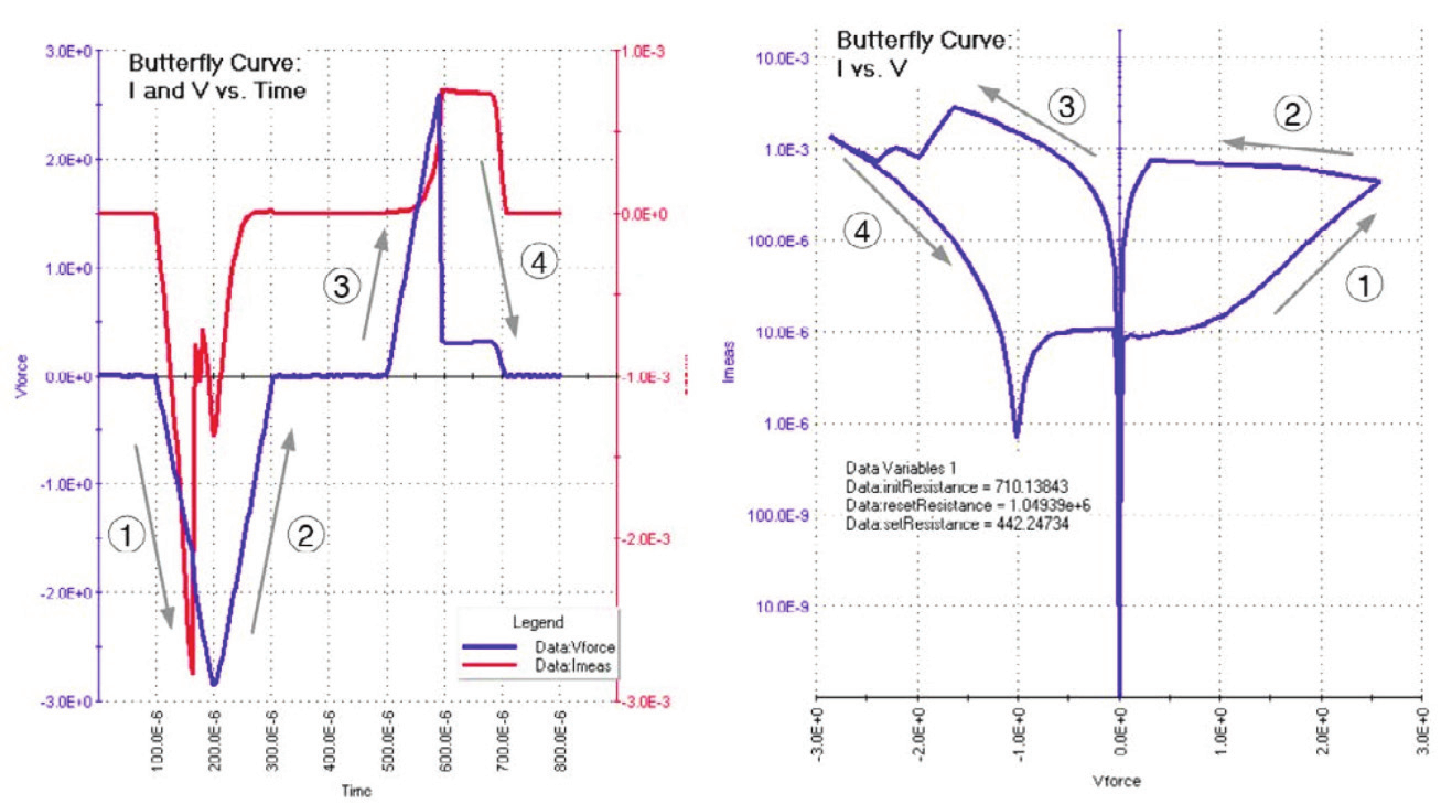 主要測試陣列中器件的I/V特性曲線,俗稱“蝴蝶曲線”,在不同的條件下表征器件的具有“存儲”的能力;根據(jù)器件的Ion/Ioff的特性和測試精度的要求,可以選擇高精度1pA量程的4200A-SMU及高精度放大器 PA;100pA量程可選2600系列源表作為測試主要硬件;源表自身具有一定的脈沖能力,如果考慮到器件自熱效應(yīng),并且脈寬要求低于100us,2600系列源表可以滿足。