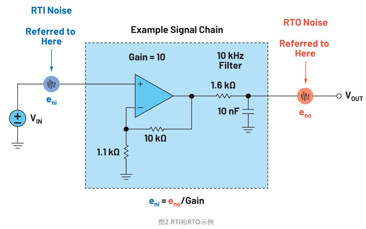圖2顯示了由同相增益級(jí)和低通濾波器組成的簡單信號(hào)鏈的RTI和RTO噪聲模型。