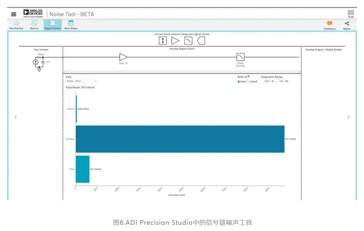 信號(hào)鏈噪聲工具 是ADI Precision Studio web工具套件的一部分,用于執(zhí)行信號(hào)鏈級(jí)的噪聲計(jì)算,包括總噪聲的積分和虛擬RTI噪聲計(jì)算。從傳感器開始構(gòu)建信號(hào)鏈,或從示例開始,然后利用信號(hào)鏈噪聲工具確定從傳感器到ADC的整個(gè)信號(hào)鏈的總噪聲和交流性能。信號(hào)鏈噪聲工具中的仿真模型使用數(shù)據(jù)手冊(cè)中的完整測量噪聲曲線來提供實(shí)驗(yàn)室精度的結(jié)果。此類工具的主要優(yōu)點(diǎn)之一是能夠加快設(shè)計(jì)過程。該工具可即時(shí)仿真電路變化對(duì)整體噪聲性能的影響,從而加快設(shè)計(jì)迭代速度。完成后的信號(hào)鏈可導(dǎo)出到LTspice進(jìn)行定制仿真。