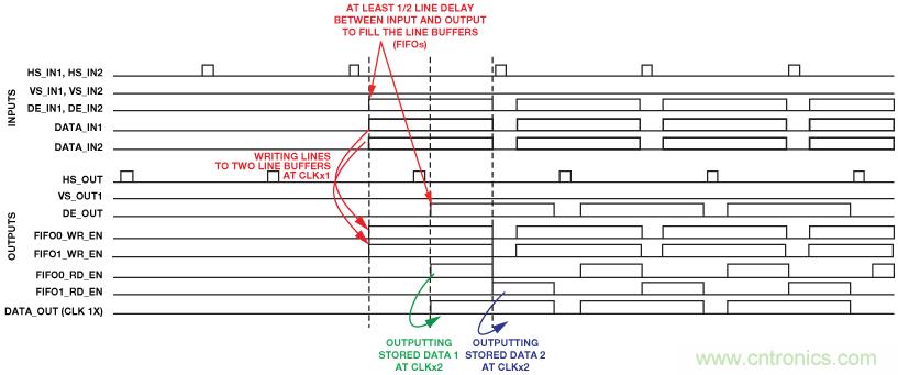 輸入數(shù)據(jù)由共用時鐘讀入存儲器。同步時序分析儀檢查輸入的同步信號,并抽取視頻時序,包括水平前后沿長度、垂直前后沿、水平和垂直同步長度、水平有效行長、垂直有效行數(shù)和同步信號極化。將該信息與當前水平和垂直像素位置一起傳給同步時序再發(fā)生器,這樣可以生成經(jīng)修改的時序,以便支持所需3D視頻結(jié)構(gòu)。新生成的時序應(yīng)延遲,以確保FIFO含有所需數(shù)據(jù)量。