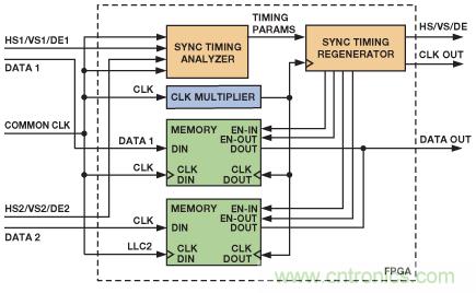 圖2所示高級功能框圖使用了采用相同視頻標準的兩臺同步攝像機、兩個視頻解碼器和一個FPGA。為了確保完全一致的幀速率,攝像機必須行鎖定到共同的參考時序。如果沒有同步,不使用外部存儲器,就不可能將輸出組合起來并存儲為完整的視頻幀。