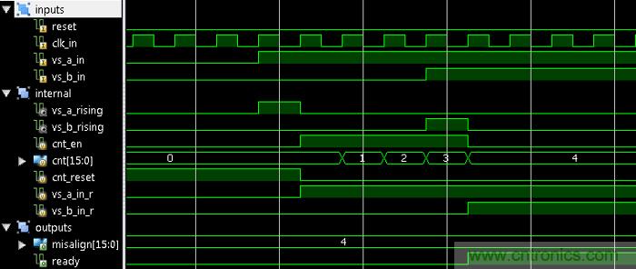兩個數(shù)字化數(shù)據(jù)流之間的對齊誤差可以在視頻FIFO輸出端進行測量,其方法是使用一個單一時鐘計數(shù)器,該計數(shù)器在輸入信號之一的垂直同步(VS)脈沖上復(fù)位。圖12所示兩個視頻流(vs_a_in和vs_b_in)的對齊誤差為4個像素。計數(shù)器使用列表1中所示方法測量對齊誤差。計數(shù)從VS1的上升沿開始,并在VS2的上升沿終止。