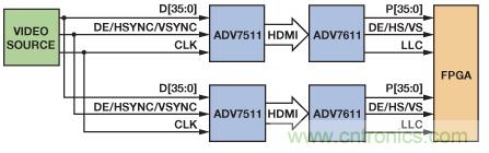 視頻解碼器和HDMI接收器都采用內(nèi)部鎖相環(huán)(PLL)在其輸出總線上產(chǎn)生時鐘和像素數(shù)據(jù)。這意味著,在數(shù)字化模擬視頻,或者接收HDMI流時,將為兩臺攝像機產(chǎn)生兩個獨立的時鐘域。另外,兩個視頻流可能存在對齊誤差。這些時序差異和對齊誤差必須在后端器件(如FPGA)中進行補償,先將數(shù)據(jù)帶至共同的時鐘域,然后再將兩個視頻圖像結(jié)合成單個立體視頻幀。然后,通過一個支持3D的HDMI 1.4HDMI 接收器(如ADV7511 或 ADV7513—也可以將其提供給DSP(如 ADSP-BF609 Blackfin®處理器)—以便進一步處理。