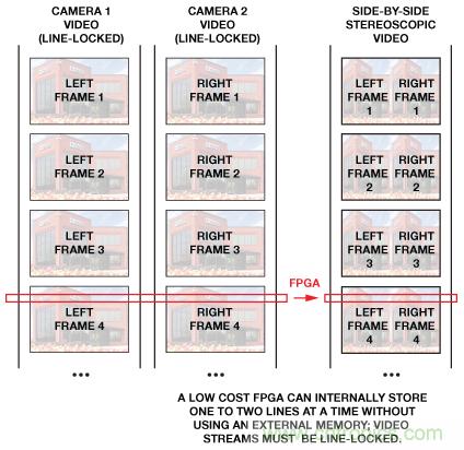 圖3顯示兩個行鎖定視頻流被合并成一個立體圖像。圖4顯示,如果不將整個視頻幀保存在外部存儲器中,則異步視頻流無法合并。