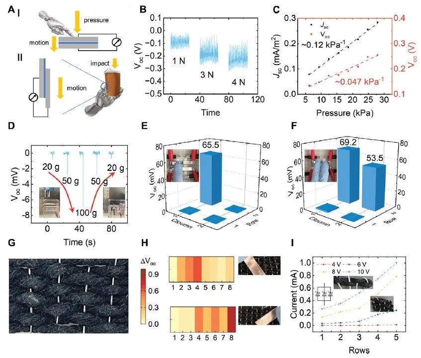本文介紹了一種基于動(dòng)態(tài)肖特基二極管 (DSD) 與纖維素纖維集成的自供電多功能智能紡織品的開發(fā)。該紡織品被設(shè)計(jì)用于持續(xù)發(fā)電并建立內(nèi)置感知網(wǎng)絡(luò) , 可檢測雙軸運(yùn)動(dòng) , 包括法向力和切向力。纖維素纖維的分層結(jié)構(gòu)為導(dǎo)電聚合物PEDOT:PSS提供了支架,形成DSD結(jié)。這些結(jié)構(gòu)作為肖特基二極管 , 可從機(jī)械刺激中產(chǎn)生電力 , 形成一個(gè)織物感知元素矩陣。作者還提出了一種緩解策略 , 以解決由于機(jī)械和電化學(xué)降解導(dǎo)致的DSD發(fā)電機(jī)壽命短的問題。所得到的智能紡織品展現(xiàn)出出色的柔韌性、可拉伸性、透氣性以及與服裝的兼容性 , 使其成為從日常運(yùn)動(dòng)中發(fā)電并實(shí)現(xiàn)多功能感知的有前景方法。