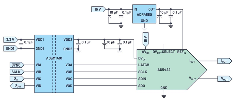 圖1.使用AD5422和ADuM1401實(shí)現(xiàn)模擬輸出級(jí)隔離控制的簡(jiǎn)化示例電路。