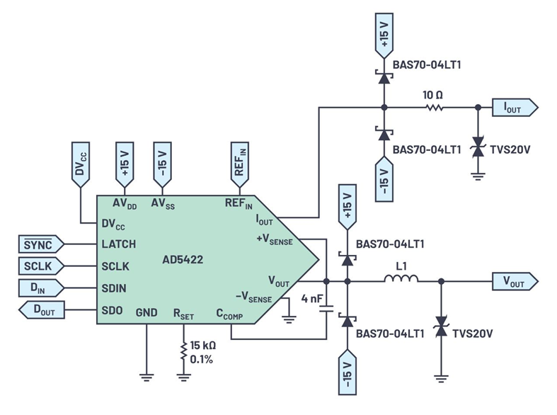 圖2.用于AD5422輸出的符合IEC 61000標(biāo)準(zhǔn)的保護(hù)電路。