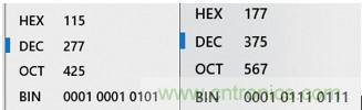 在DEC分別輸入277和375,得到其二進制分別為0001 0001 0101和0001 0111 0111,十六進制為0115h和0177h。