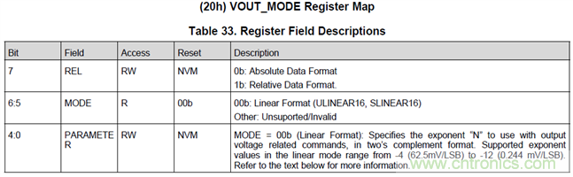 4. 確定VOUT_COMMAND的最小步進值LSB。LSB可由VOUT_MODE(20h)確定。VOUT_MODE在PMBUS的定義中,是一個1 byte的寄存器,地址為20h,用于定義和輸出電壓有關(guān)的寄存器值的格式和步進值。