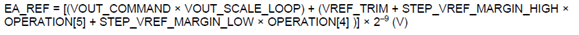 3. 由EA_REF算式,確定VOUT_COMMAND范圍,EA_REF的算式如下,出廠默認設(shè)置時,VOUT_SCALE_LOOP為1,VREF_TRIM,STEP_VREF_MARGIN_HIGH×OPERATION[5]和STEP_VREF_MARGIN_LOW×OPERATION[4]為0。一般而言,STEP_VREF_MARGIN_HIGH和STEP_VREF_MARGIN_LOW這兩個寄存器是用來在量產(chǎn)時進行拉偏測試用,預(yù)先設(shè)定好STEP_VREF_MARGIN_HIGH拉偏上限,STEP_VREF_MARGIN_LOW拉偏下限,在產(chǎn)線上僅需要置位OPERATION寄存器[5]和[4]即可進行拉偏測試,非常簡便。