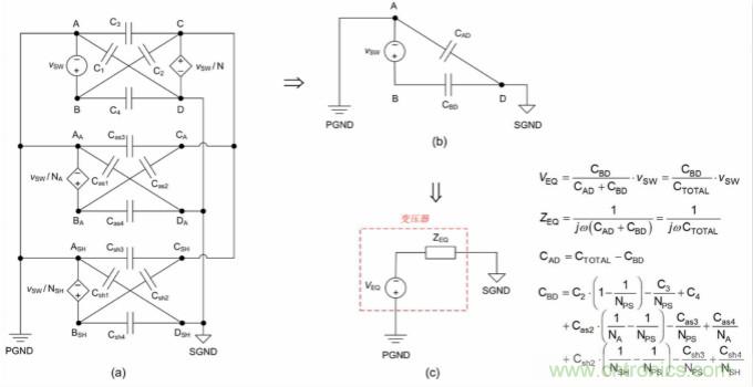 圖 6:(a) 多繞組反激式變壓器集總 CM 寄生電容模型;(b) 雙電容 CM 模型;(c) 戴維寧等效電路