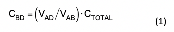 雙電容 CM 噪聲模型可靈活地用于不同的隔離型穩(wěn)壓器拓?fù)?,并有助于通過實(shí)驗(yàn)測量推導(dǎo)出變壓器集總電容模型[13]。CTOTAL 是用阻抗分析儀測得的變壓器結(jié)構(gòu)化繞組間電容,測量時(shí)將初級(jí)側(cè)和次級(jí)側(cè)端子短接,然后將變壓器用作單端口網(wǎng)絡(luò)。對(duì)初級(jí)側(cè)繞組端子(A、B)施加源阻抗為 50W 的開關(guān)頻率正弦激勵(lì)信號(hào),并測量 VAD 與 VAB 的電壓比,可由公式 1 推導(dǎo)出 CBD:
