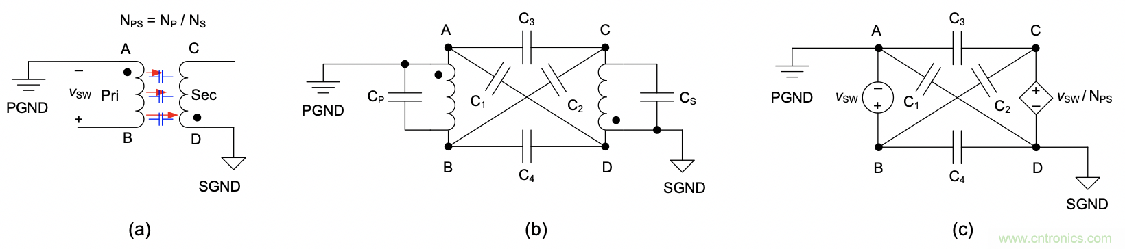 圖 4.(a) 用于 CM 噪聲分析的雙繞組變壓器;(b) 六電容 CM 模型;(c) 四電容 CM 模型。