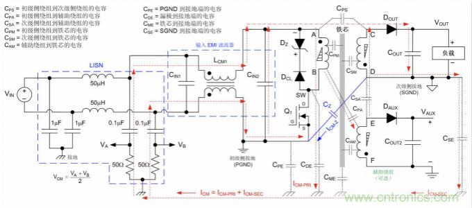 圖 3:雙線 DC-DC 反激式穩(wěn)壓器(輸入端連接有 LISN)的 CM 噪聲電流傳播路徑。同時(shí),還顯示了初級(jí)側(cè)基準(zhǔn)的輔助輸出端