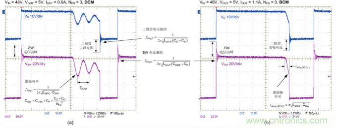 圖 2:以 DCM (a) 和 BCM (b) 模式運(yùn)行的反激式轉(zhuǎn)換器初級(jí)側(cè) MOSFET 和次級(jí)側(cè)二極管電壓波形;跨越初級(jí)側(cè)繞組的 DZ 電路可鉗位與漏電感相關(guān)的電壓尖峰