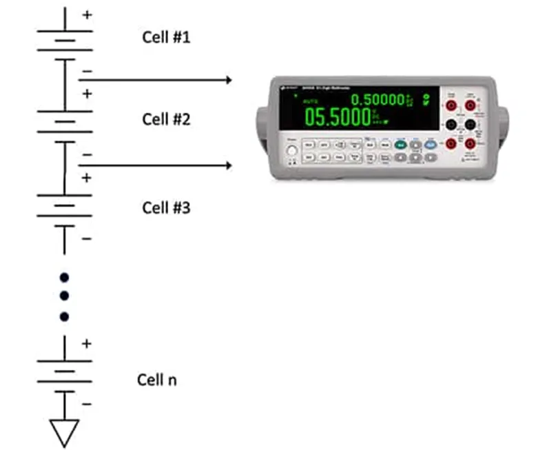 圖 1:測量串聯(lián)電池的任何單個電池單元的電壓從概念上來講非常簡單,只需要一塊浮動數(shù)字電壓表即可。(圖片來源:Bill Schweber)