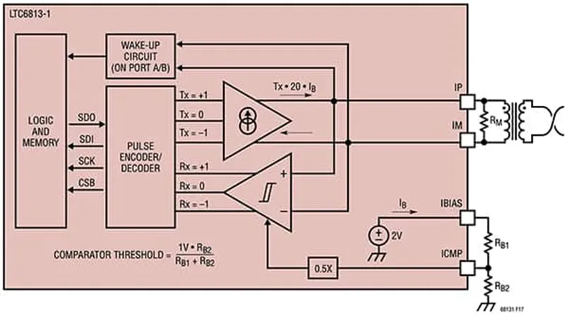在其兩線配置模式下,隔離是通過外部變壓器實現(xiàn)的,標(biāo)準(zhǔn) SPI 信號被編碼為差分脈沖。傳輸脈沖強度和接收器閾值水平通過兩個外部電阻 RB1 和 RB2 設(shè)定(圖 11)。電阻值由設(shè)計人員選擇,以便在功率耗散和抗噪強度之間進行權(quán)衡。