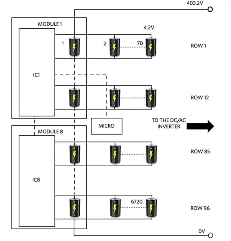 每個電池單元的容量為 3.54 安培小時 (Ah),因此總標(biāo)稱儲能為 100 千瓦小時(3.54 Ah x 4.2 V x 6720 個電池單元)。在 96 個以串聯(lián)形式連接的電池單元組中,每組包括 70 個以并聯(lián)方式連接的電池單元,電池電壓為 403.2 V(96 × 4.2 V),容量為 248 Ah(100 kWh/403.2 V 或 3.54 A × 70)。
