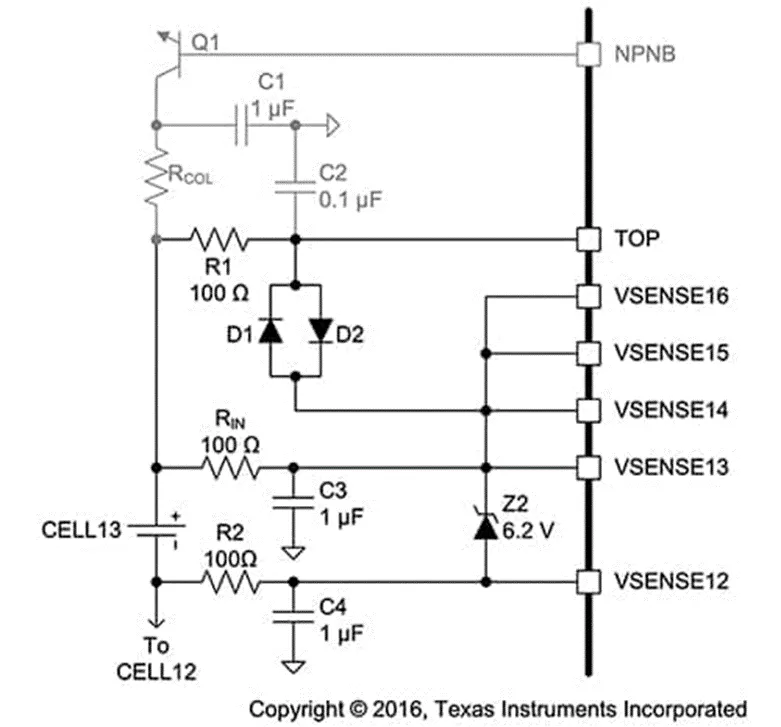 這種 BMS 可以輕松處理最多不超過 16 個電池單元的電池串。這樣做的唯一限制是必須按照升序使用輸入,將所有未使用的輸入一起連接至未使用最高 VSENSE_ 輸入。例如,在 13 個電池單元的設(shè)計中,輸入 VSENSE14、VSENSE15 和VSENSE16 未使用(圖 7)。