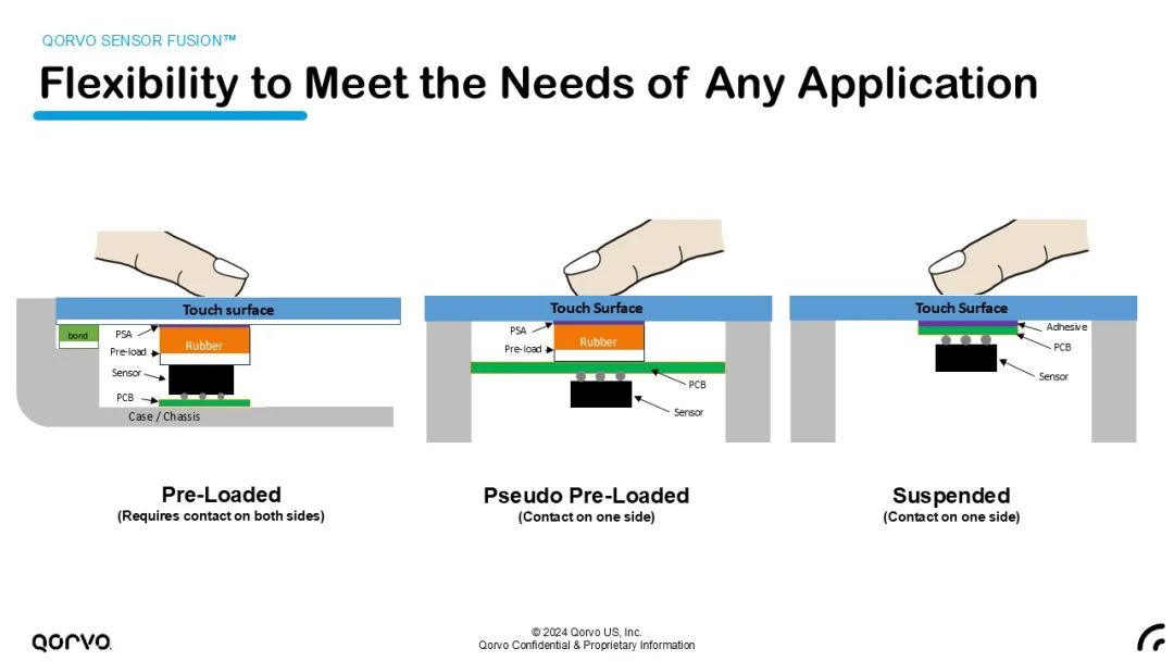 Qorvo 的 Sensor Fusion 方案能夠適用于任何材料,不受大多數(shù)環(huán)境的影響,做到防水、防油、防誤觸。為滿足不同應用場景對于靈敏度和生產(chǎn)工藝的需求,Qorvo 還提供了直壓式、背貼式等多種傳感器堆疊方式,旨在幫助終端廠商更方便靈活地為消費者提供更炫酷的工業(yè)設計、更享受的操作體驗。