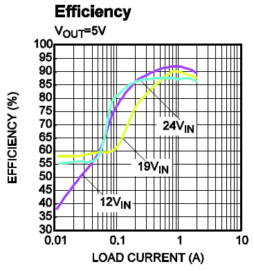 分別測(cè)試電路的輸入和輸出的電流、電壓數(shù)據(jù),并轉(zhuǎn)換成效率與輸出電流的對(duì)應(yīng)數(shù)據(jù),最后繪制成曲線: