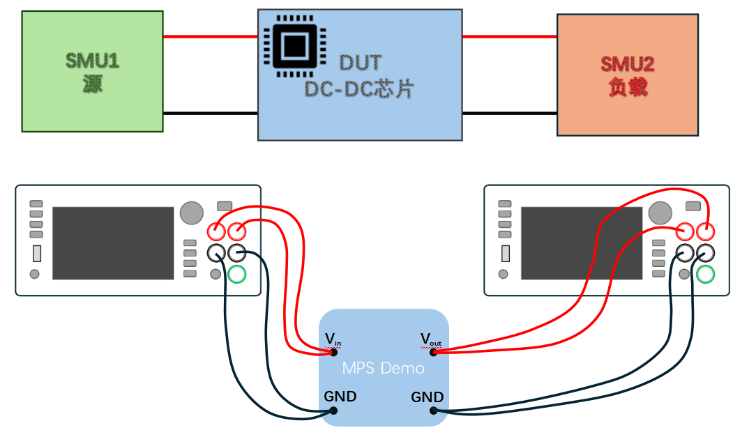 1.連接被測(cè):使用2臺(tái)單通道的源表,或者1臺(tái)雙通道的源表進(jìn)行連接。一個(gè)測(cè)試單元作為電源使用,一個(gè)測(cè)試單元作為負(fù)載使用,同時(shí)監(jiān)測(cè)被測(cè)上輸入、輸出的電壓和電流。連接如圖: