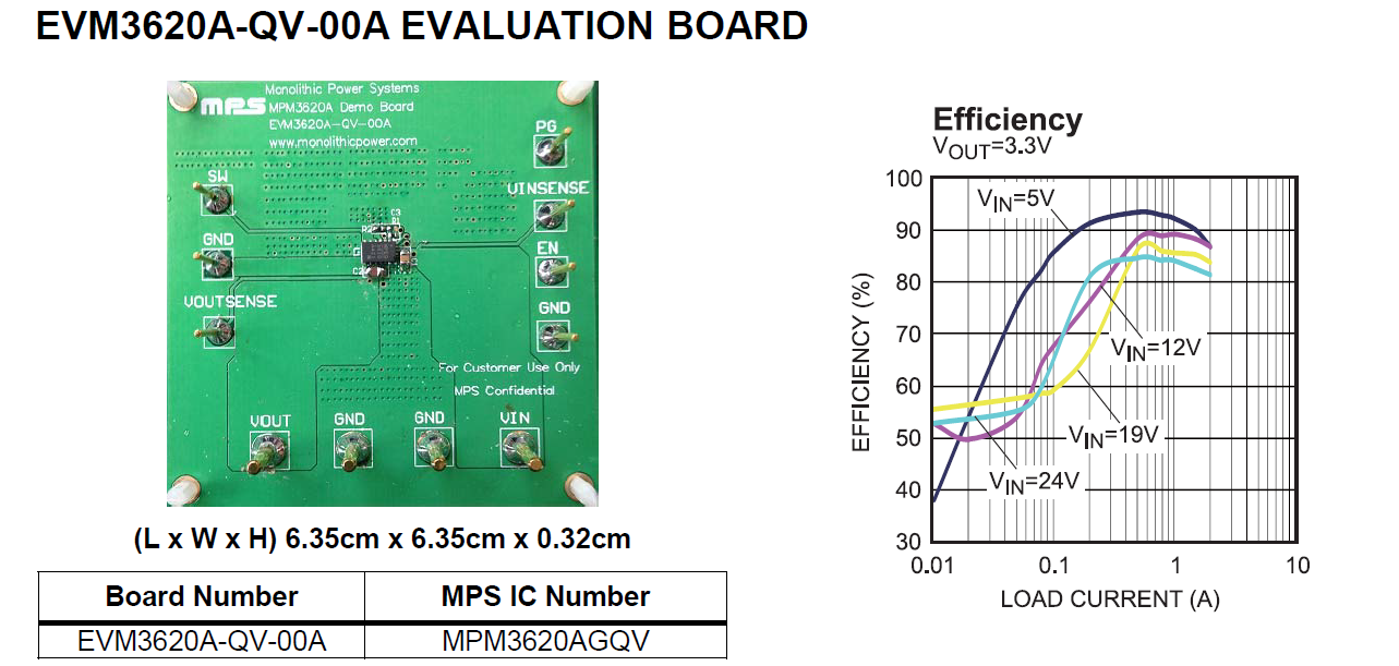 這里使用了MPS的EVM3620測(cè)試評(píng)估板進(jìn)行驗(yàn)證,參數(shù)如下: