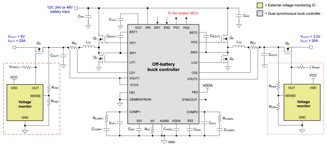 同步降壓控制器集成電路 (IC) 可在汽車設(shè)計中實現(xiàn)直流/直流轉(zhuǎn)換,這些設(shè)計采用 12V、24V 和 48V 電池輸入,滿足大電流處理器負載的要求,其電流規(guī)格通常超過 100A。圖 1 展示了一種雙輸出配置,該配置在系統(tǒng)的每個輸出上都包含一個電壓監(jiān)控 IC,以實現(xiàn) ASIL D 功能安全合規(guī)性。