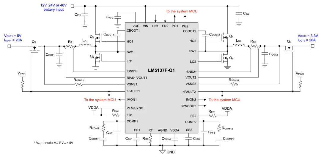 圖 2:使用 LM5137F-Q1 降壓控制器實現(xiàn) ASIL D 的非電池供電雙路輸出降壓前置穩(wěn)壓器
