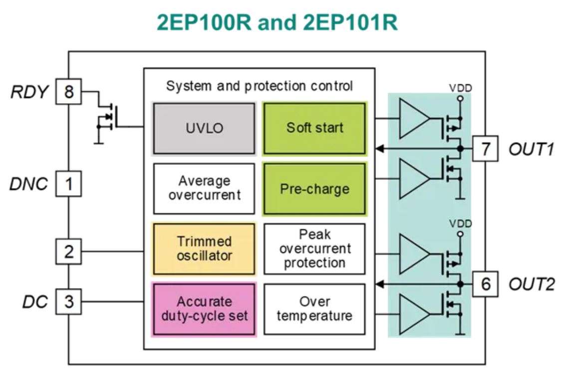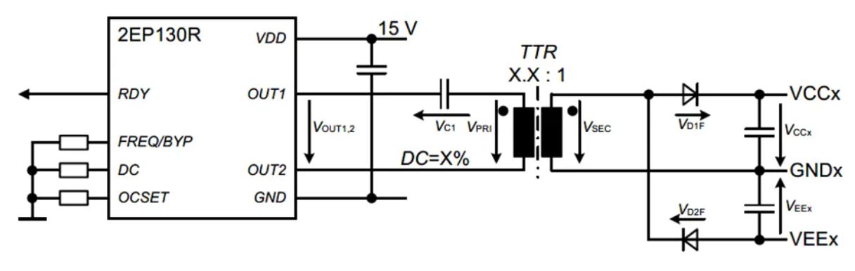 2EP占空比10%-50%可調(diào),使得正負輸出比范圍為1:1到9:1,而變壓器初次級繞組匝數(shù)比決定輸出正負電壓值,可以方便匹配IGBT、SiC MOSFET驅(qū)動電路設(shè)計需要。