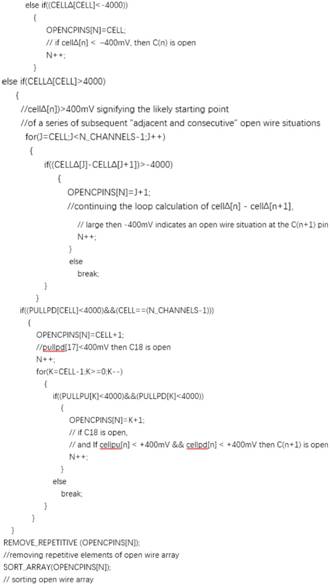 第4步:繼續(xù)第3步中描述的循環(huán)計(jì)算。當(dāng)開路情況停止時(shí),CELLΔ[n]和CELLΔ[n+1]的差值不再大于-400 mV,而是會(huì)變成一個(gè)非常大的負(fù)值。當(dāng)檢測(cè)到結(jié)果小于-400mV時(shí),表示一系列相鄰連續(xù)開路終止于Cn引腳位置。此時(shí),跳過之前檢測(cè)到的開路位置,重復(fù)第2步至第4步的計(jì)算,直至完成所有18個(gè)電芯通道和C引腳(不包括C0引腳和C18引腳)的所有開路檢測(cè)。