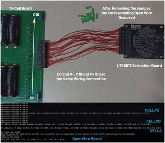 至于圖12中的C0引腳開路,它將導(dǎo)致芯片無法正常執(zhí)行ADOW命令。在這種情況下,C0引腳開路無法通過ADOW命令識(shí)別。盡管如此,芯片仍然可以執(zhí)行ADCV命令來完成電芯電壓檢測(cè),并且可能發(fā)現(xiàn)CELL1的電壓轉(zhuǎn)換結(jié)果異常低,從而表明C0引腳可能存在開路情況。但是,該方法不被視為本文所述算法的一部分。