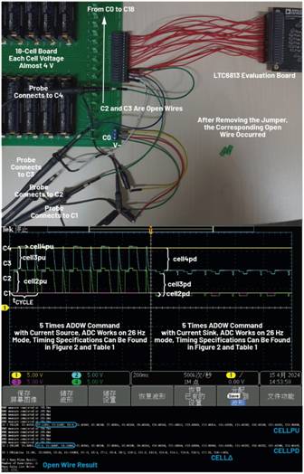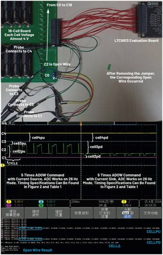 同樣,我們使用LTC6813評(píng)估板(DC2350B)和18650電池,開展了檢測(cè)C引腳上多處開路的實(shí)際實(shí)驗(yàn)和波形測(cè)試。這讓我們能夠更清楚地了解LTC6813電路在多處開路檢測(cè)期間的行為。測(cè)試結(jié)果如圖7和圖8所示。在圖7所示的電路測(cè)試中,C2引腳和C3引腳位置同時(shí)出現(xiàn)開路;而在圖8所示的電路測(cè)試中,C2引腳、C3引腳和C4引腳位置同時(shí)出現(xiàn)開路。另外,圖7和圖8還提供了在ADOW命令執(zhí)行期間,相應(yīng)開路情況下CELL2/CELL3/CELL4的波形測(cè)試結(jié)果。從測(cè)試結(jié)果來看,觀察到的電路行為變化與圖5和圖6所示一致。