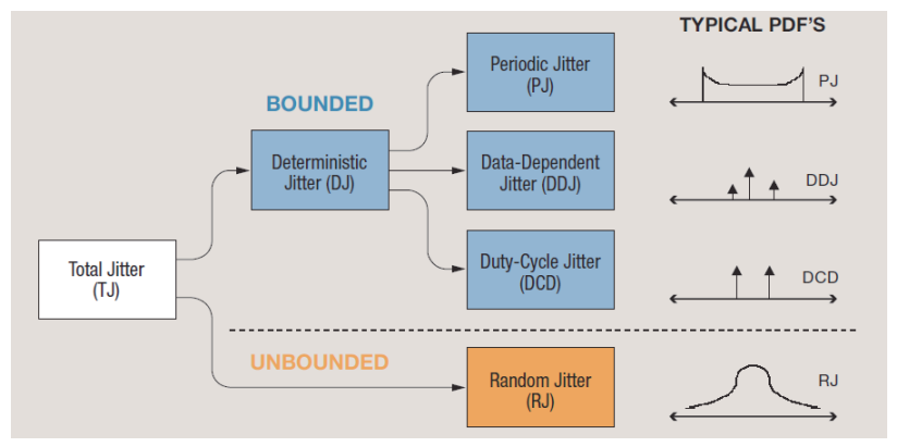 經(jīng)典理論下,信號的總體抖動 (Tj, Total Jitter) 可以分成以下幾類。通過示波器的抖動軟件,測量出每種抖動成分的大小,想辦法將最嚴重的抖動成分降低,總體抖動就能降下來了。