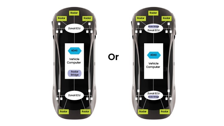 分布式雷達(dá)架構(gòu)通過對傳感器數(shù)據(jù)進(jìn)行區(qū)域或集中處理,提供了一種高級的傳感器管理和數(shù)據(jù)融合方法,這對于激發(fā)下一代雷達(dá)傳感器的潛在性能至關(guān)重要。正如前文提到,雷達(dá)橋能在區(qū)域或中央計(jì)算平臺上處理和融合雷達(dá)傳感器數(shù)據(jù),并且能與視覺感知數(shù)據(jù)進(jìn)行進(jìn)一步的整合。這類雷達(dá)處理器的應(yīng)用范圍極廣,因?yàn)樗试S客戶輸出點(diǎn)云或雷達(dá)對象。雷達(dá)橋的位置靈活,可以與中央電子控制單元(ECU)中的視覺處理器或區(qū)域ECU中的區(qū)域控制器并置。