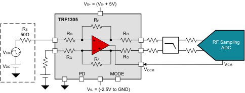 圖 1:TRF1305 射頻 FDA 直流耦合到射頻采樣 ADC