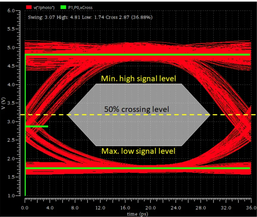 高級(jí)信號(hào)完整性仿真器允許用戶指定眼圖模板,以便根據(jù)仿真數(shù)據(jù)計(jì)算比特誤碼率。這些仿真器可以直接處理 PCB 布局?jǐn)?shù)據(jù),并確定串?dāng)_、ISI 和抖動(dòng)的合理準(zhǔn)確估計(jì)值。雖然噪聲容限是這些仿真的一項(xiàng)輸入?yún)?shù),但無需手動(dòng)檢查眼圖中的每條軌跡,即可判斷通道的合規(guī)性。