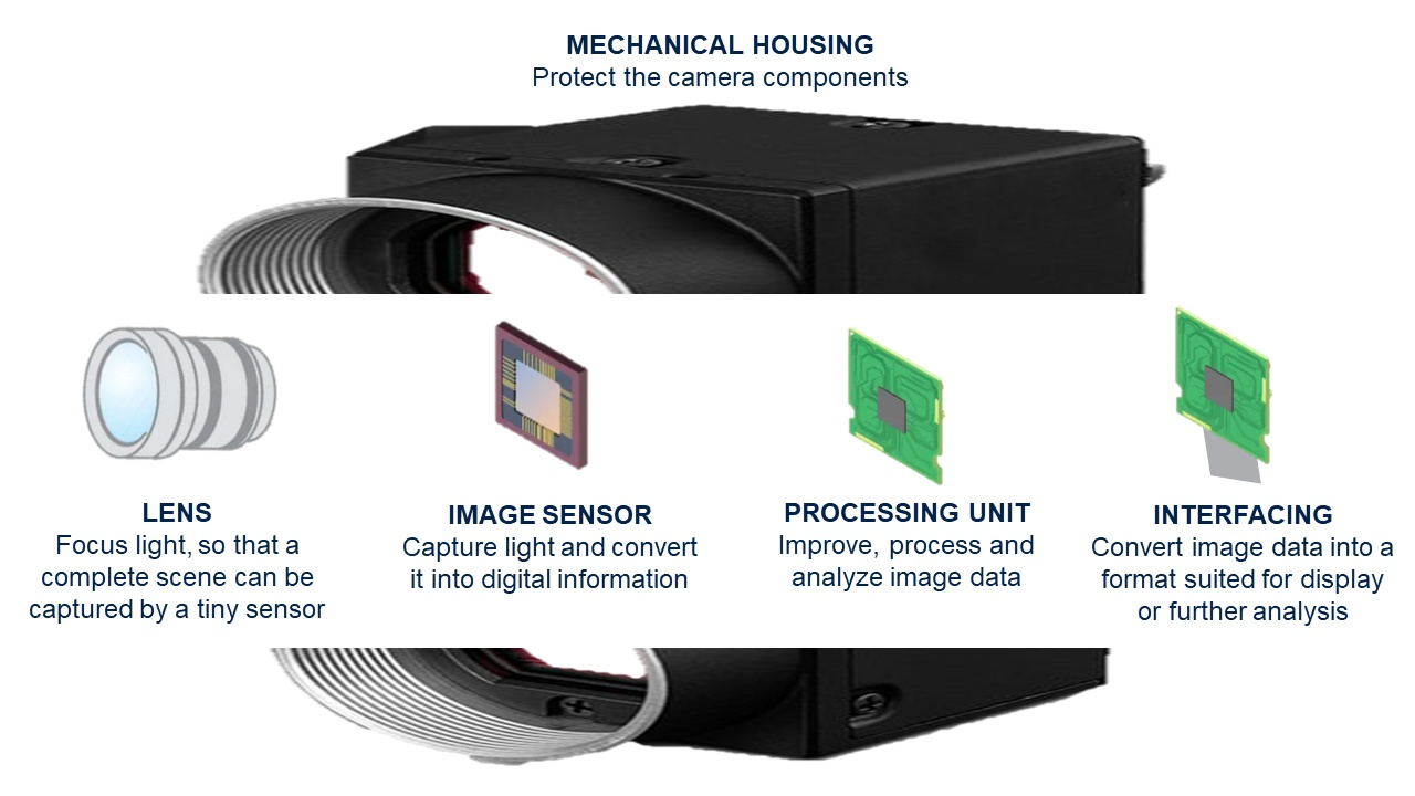 圖像傳感器由數(shù)百萬個微小的感光元件(像素)組成,這些感光元件可以捕捉光(光子)并將其轉(zhuǎn)換為電信號(電子)。這些感光元件對于拍攝數(shù)字圖像至關(guān)重要,但它們只是攝像系統(tǒng)中的一個環(huán)節(jié)。每個攝像機都通過鏡頭將光線聚焦到圖像傳感器上,將其轉(zhuǎn)換為原始數(shù)字信息,然后通過處理器(比如專用圖像處理器或應(yīng)用處理器)處理和分析圖像數(shù)據(jù)。最后一個環(huán)節(jié)是圖像輸出接口,將處理單元輸出的圖像數(shù)據(jù)轉(zhuǎn)換為適合在設(shè)備上顯示的格式或適合進(jìn)一步分析的格式。