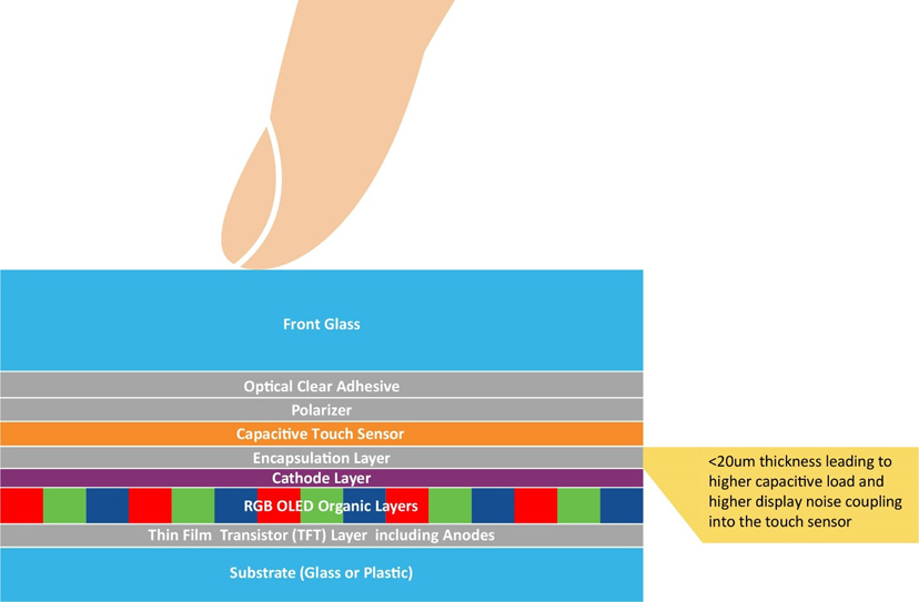 盡管采用On-cell技術(shù)可以讓OLED顯示屏變得更薄,但也給觸摸屏控制器帶來(lái)了新的挑戰(zhàn)。這是因?yàn)橛|摸電極變得更加靠近陰極層和顯示像素(見(jiàn)圖1:汽車On-cell觸摸OLED堆疊結(jié)構(gòu))。采用On-cell設(shè)計(jì)后,觸摸電極對(duì)地的電容負(fù)載現(xiàn)在變得更高。盡管手指觸摸電容大小沒(méi)有改變,但手指觸摸的靈敏度有所降低。