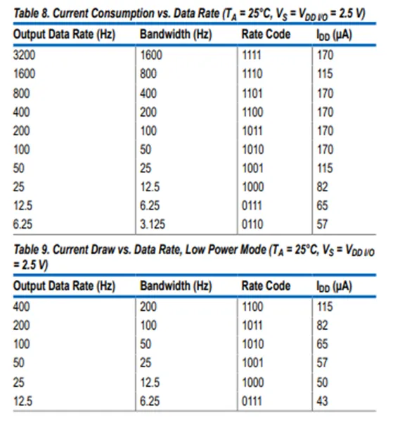 3. 噪聲譜密度 (μg/√Hz):噪聲譜密度是噪聲的功率譜密度或每單位帶寬的噪聲功率。這種噪聲隨著帶寬的倒數(shù)平方根而變化。我們讀取加速度計(jì)變化的速度越快,準(zhǔn)確性就越差。當(dāng)輸出信號(hào)在較低g條件下較小時(shí),噪聲對(duì)加速度計(jì)性能的影響較大。