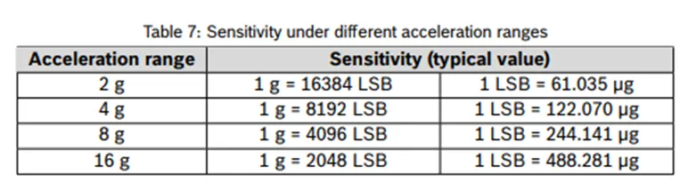 例如,BMA530支持不同的加速度范圍,因而靈敏度也不盡相同,如下表所示。