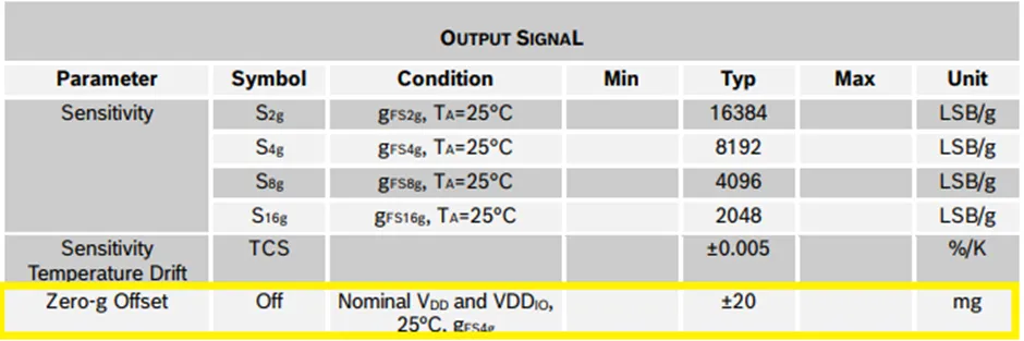 例如,BMA456的一般零重力偏移約為±20mg。這意味著,零重力輸出通常在預(yù)期的理想值上下±20mg范圍內(nèi)變化。