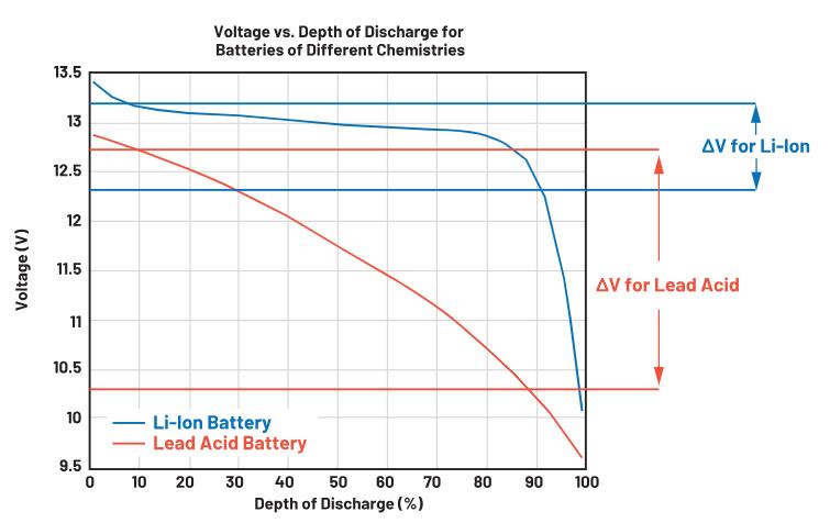 為了在實際應用中更好地說明這一點,可以分析圖2,該圖比較了鉛酸電池和鋰離子電池的DoD??梢杂^察到,當鋰離子電池的DoD從0%增加到80%時,電池包電壓變化極小。80% DoD通常是鋰離子電池的下限,如果低于該值,可能被視為危險水平。