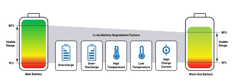 圖5列舉了造成鋰離子電池退化的一些因素。值得注意的是,這些因素可能會引起燃燒和爆炸等危險情況,并且可能會迅速釀成災難2。
