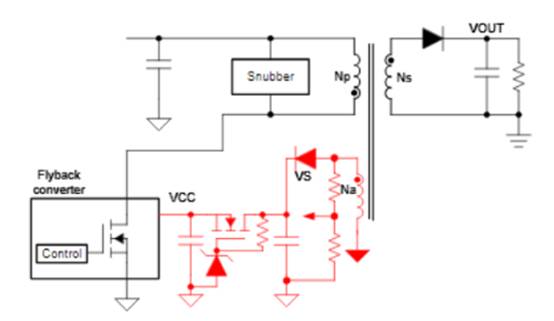 接下來將進入實際設計絕緣型反激式轉換器。首先,先貼出使用例題所選擇的控制IC"BM1P061FJ:AC/DC用 PWM 控制器IC"的電路圖。 詳細閱讀>>